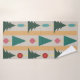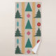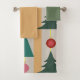 Dieses Handtuchhandtuch ist mit einem grünen Waschlappen, einem goldenen Handtuch und einem Badetuch ausgestattet, das im modernen Design der Weihnachtsbäume und -dekorationen aus der Mitte des Jahrhunderts auf einer goldenen und silbernen Gartenanlage aufgereiht ist.