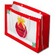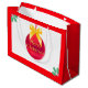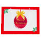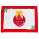 Roter Weihnachtsball mit gelbem Band in der Mitte auf weißem Hintergrund Geschenktasche. Text kann angepasst werden.