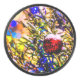 Weihnachtsbaum und rote Zierkugel mit frischem Schnee bedeckt. Farbiges Licht. Fröhliche und fröhliche Stimmung. Frohe Weihnachten und glückliches Neues Jahr. Die Grüße der Saison. Drucke und Geschenke für jeden zum Spaß und gute Laune. Produkte und Souvenirs im runden Seitenverhältnis.