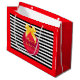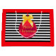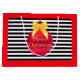 Roter Weihnachtsball mit gelbem Band in der Mitte auf schwarz-weiß gestreiftem Hintergrund Geschenktasche. Text kann angepasst werden.