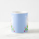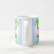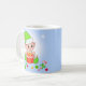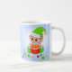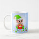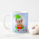 Moderne niedliche Weihnachtself mit Geschenkboxen, Weihnachtsbällen, Zuckerrohr und Stern auf hellblauem Hintergrund Weihnachten Tasse. Name kann personalisiert sein.
