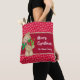 Fügen Sie eine Touch saisonalen Beifall zu Ihrem Shopping-Trip mit dieser bezaubernden Urlaubstasche. In der Tasche befindet sich ein Teddybär, der einen grünen Schal trägt und Weihnachtsgeschenke und einen Bonbonstock trägt. Der Hintergrund ist rot und weist weiße, fallende Schneeflocken auf. In der Mitte befindet sich ein dunkelrotes Band mit goldener Grenze und Platz für Ihren frohen Weihnachtsgrüß und Ihren Familiennamen.