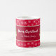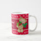 Fügen Sie Ihrer Zuhause eine Touch saisonalen Beifall mit dieser köstlichen Kaffee-Tasse hinzu. In der Tasse befindet sich ein Teddybär, der einen grünen Schal trägt und Weihnachtsgeschenke und einen Bonbonstock trägt. Der Hintergrund ist rot und weist weiße, fallende Schneeflocken auf. In der Mitte befindet sich ein dunkelrotes Band mit goldener Grenze und Platz für Ihren frohen Weihnachtsgrüß und Ihren Familiennamen.