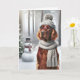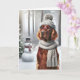 Ein Hund mit einem grauen Strickhut und Schal steht zu Weihnachten in einem schneebedeckten Wald neben einem Schneemann