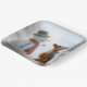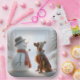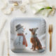 Ein Schneemann und ein irischer Setter-Hund, der Schals trägt, teilen sich einen Moment der Begleitung in einem schneebedeckten Wald