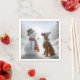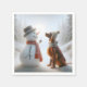 Ein Schneemann und ein irischer Setter-Hund, der Schals trägt, teilen sich einen Moment der Begleitung in einem schneebedeckten Wald