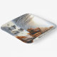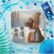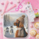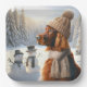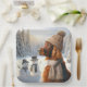 Ein irischer Setter-Hund ist in einem Wollhut und Schal stehend, in einer schneebedeckten Landschaft mit zwei lächelnden Schneemännern im Hintergrund