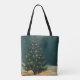 Vintage Abbildung Viktorianisch Frohe Weihnachtsfeiergestaltung mit schneebedeckter Landschaft. Eine Schneefall mit einem Weihnachtsbaum, der an einem Winterabend mit hellen Lichtern geschmückt ist, mit einem sternhaften Nachthimmel und Schnee auf dem Boden. Glückliche Feiertage und Grüße der Saison!
