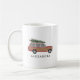 Illustration eines mit rotem Holz verkleideten SUV-LKW mit Weihnachtsbaum oben. Personalisieren Sie den Namen.