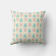 Ein Kissen mit niedlichem Weihnachtsmuster. Ein cremefarbener Hintergrund. Illustrationen von pastellfarbenen, grün-blauen, Weihnachtsbäumen und pastellrosa Bausteine und Bögen in einem sich wiederholenden Muster.