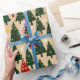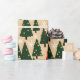 Ein sich wiederholendes Muster von Weihnachtsbäumen mit verschiedenen Zierfarben schmückt einen beigen Hintergrund mit Schneeflocken.