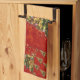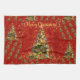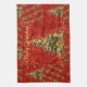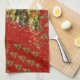 Freuen Sie sich auf ein fröhliches und elegantes Küchenhandtuch mit einem schönen grünen Weihnachtsbaum, der mit farbenfrohen Ornamenten und strahlenden Lichtern über rotem Hintergrund geschmückt ist.