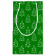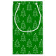 Eine Geschenktasche mit weißem Weihnachtsbaummuster auf grünem Hintergrund. Passen Sie die grüne Hintergrundfarbe, die Mustergröße unter anderen Optionen an.