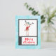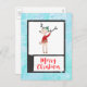 Postcard mit niedlicher skurriler Illustration eines lustigen Weihnachtsrentiers in einem hässlichen Pullover, perfekt für die Ferienzeit. Er ist auf 2 Beinen stehend und winkt hallo. Er hat große Geweihe und eine niedliche, grün gestrickte Wintermütze. Im folgenden Text steht frohe Weihnachten in einem handgeschriebenen Schriftart in festlicher Rottönung. Die Botschaft auf der Rückseite kann individuell angepasst oder verlassen werden. Der Hintergrund ist ein blaues, frostig aussehendes Aquarelldesign.