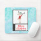 Mousepad mit einer niedlichen skurrilen Illustration eines lustigen Weihnachtsrentiers in einem hässlichen Pullover, perfekt für die Ferienzeit. Er ist auf 2 Beinen stehend und winkt hallo. Er hat große Geweihe und eine niedliche, grün gestrickte Wintermütze. Im folgenden Text heißt es frohe Weihnachten in einem handgeschriebenen Schriftart in festlich roter Farbe. Der Hintergrund ist ein blaues, frostig aussehendes Aquarelldesign.