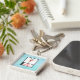 Schlüsselanhänger mit einer niedlichen skurrilen Illustration eines lustigen Weihnachtsrentiers in einem hässlichen Pullover, perfekt für die Ferienzeit. Er ist auf 2 Beinen stehend und winkt hallo. Er hat große Geweihe und eine niedliche, grün gestrickte Wintermütze. Im folgenden Text heißt es frohe Weihnachten in einem handgeschriebenen Schriftart in festlich roter Farbe. Der Hintergrund ist ein blaues, frostiges, eisfarbenes Aquarelldesign.