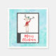 Papierservietten mit einer niedlichen skurrilen Illustration eines lustigen Weihnachtsrentiers in einem hässlichen Pullover, perfekt für die Ferienzeit. Er ist auf 2 Beinen stehend und winkt hallo. Er hat große Geweihe und eine niedliche, grün gestrickte Wintermütze. Im folgenden Text heißt es frohe Weihnachten in einem handgeschriebenen Schriftart in festlich roter Farbe. Der Hintergrund ist ein blaues, frostiges, eisfarbenes Aquarelldesign.