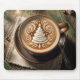 Eine schön detaillierte Latte-Kunst in einer braunen Kaffeetasse zeigt ein Weihnachtsbaumdesign.
