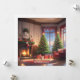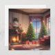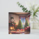 Eine personalisierte Weihnachtskarte mit einem geschmückten Raum, der mit einem Weihnachtsbaum, einem Kamin und Strümpfen am Kamin ausgestattet ist.
