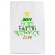 Weihnachten bedeutet für jeden Menschen vieles. Diese Weihnachtsbaumgeschenktasche stellt nur einige dieser Ideen dar: Freude, Hoffnung, Glaube, Freude, Liebe. Die Wörter sind in Grün geschrieben, um die Form des Baumes zu bilden, wobei das Wort Liebe in Braun steht, um den Baumstamm zu bilden, und mit einem gelben Stern überzogen ist. Die Weihnachtsbaumsammlung enthält zusätzliche Party-Vorräte.