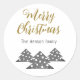 Weihnachtsbaum Moderner Familienurlaub Klassischer Rundsticker. Drei einfache graue Weihnachtsbäume mit weißen Kugeln. Der Text Frohe Weihnachten ist in einem trendigen Skript. Passen Sie Ihren Text an.