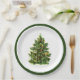Set einen festlichen Urlaubstisch mit dieser Weihnachtsbaumpapiertafel. Auf dieser Papiertafel befindet sich ein Weihnachtsbaum aus Jahrgang, der mitten in einem cremefarbenen, weißen Hintergrund steht. Es gibt auch einen grünen Rahmen für den Urlaub.