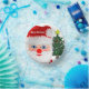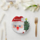 Frohe Weihnachten ist in festlicher weißer Typografie über den rot-weißen Furry Hut des Weihnachtsmanns geschrieben. Jolly Santa Claus mit rosa Wangen, blauen Augen, weißem Bart, großer roter Nase und rotem, weißem Hut. Im Hintergrund ist der altmodische Weihnachtsbaum mit Lebkuchenmann, Bonbons, Ziergegenständen und gelbem Stern dekoriert. Original Artwork © 2013, 2015 TamiraZDesign.