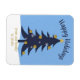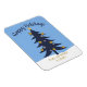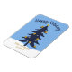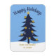 Niedlicher Cartoon dunkelblauer immergrüner Baum mit einem goldenen Stern und simulierten Glitzer kreisrunden Kugel Ornamente. Der Baum ist umgeben von einem strahlend blauen Himmel und weißen fallenden Schneeflocken. Der Baum ist auf einer weißen Schneebank. Glückliche Ferien in blauem Schriftart und eine zweite Zeile in dunkelgoldgelben/braunen Schriftart können mit Ihrer eigenen Nachricht angepasst werden.