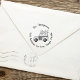 Das holzseitige Auto, das auf dem Weihnachtsbaumgelände auf Zuhause fährt, mit einem niedlichen, lustigen, lustigen und lustigen, minimalistischen Winterminimalismus, trendigen Kalligrafieschrift, Schriftart-Typografie, Weihnachts-Rücksendeadresse-Briefmarke, Weihnachts-Weihnachtsmails, Weihnachtsferien-Briefmarke, niedlicher Spaß humorvoller, Weihnachts-Weihnachts-Weihnachts-Weihnachts-Cartoons-Briefmarken--