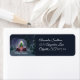 Eine große Schneeglobe mit festlich rotem Sockel, die einen verzierten Weihnachtsbaum mit einem hellgelben Stern auf der Oberseite und farbenfrohen Geschenken enthält, liegt nachts in einem schneebedeckten Wald mit Vollmond im Hintergrund.