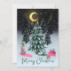 In einer schneebedeckten Nachtszene befindet sich ein Weihnachtsbaum mit bunten Lichtern, umgeben von großen immergrünen Bäumen. Der Halbmond strahlt in den Himmel, und am Fuß des Baumes werden Geschenkboxen mit einer festlichen "Frohen Weihnachten"-Nachricht arrangiert. Handgezeichnet in Procreate mit so viel Liebe.