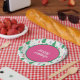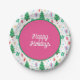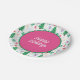 Festliche Teller für Ihre nächste Feier mit einem fröhlichen und hellen Muster von Weihnachtsbäumen, Weihnachtsgeschenken, Regenbogenkonserven, rosa und roten Strumpf und Weihnachtsbonbons.