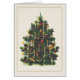Vintage Weihnachtsbaum Illustration mit Ornamenten, Kerzen und Spielzeug wie Puppen, Trommeln und Trompeten dekoriert. Heller Elfenbeinhintergrund mit doppelter Goldgrenze. Leere Inneneinrichtung.