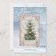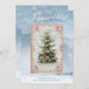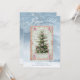 Ein altes Weihnachtsbaum-Label Kunst-Illustration-Overlay auf einem Aquarellschnee-Hintergrund in tiefblauem und weißem Weiß. Auch die Schneeszene auf der Rückseite. Eine saisonale Karte mit einer sanften, ruhigen Naturlandschaft für ein gemütliches Ambiente.