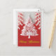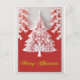 Feierliche Weihnachtsbaumdekorationen mit einem weißen Baum, der mit roten Ornamenten und einem schönen Stern geschmückt ist und vor einem kühnen roten Hintergrund für eine beeindruckende Urlaubspräsentation steht.