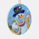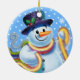 Runde Weihnachtsbaumdekoration Snowman und Tinkel. Blues. Dieser fröhliche Schneemann ist dabei, seinen Baum mit farbenfroher Tüte zu dekorieren. Sehen Sie sich die anderen Buchstaben in dieser Serie an, Santa und Polar Bear und Rudolph.