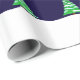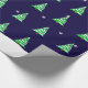 WeihnachtsPackpapier mit einem Muster der Weihnachtsbäume und des Schnees blättert auf einem dunkelblauen Hintergrund ab.