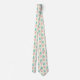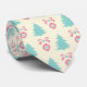Eine Krawatte mit festlichen Weihnachtsmustern auf cremefarbenem Hintergrund. Illustrationen von pastellfarbenen, grün-blauen, Weihnachtsbäumen und pastellrosa Bausteine und Bögen in einem sich wiederholenden Muster.