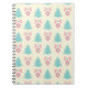 Ein Notizbuch mit festlichen Weihnachtsmustern auf cremefarbenem Hintergrund. Illustrationen von pastellfarbenen, grün-blauen, Weihnachtsbäumen und pastellrosa Bausteine und Bögen in einem sich wiederholenden Muster.