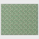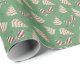 Die Weihnachtsgeschenkpackung zeigt ein Muster aus weißen Weihnachtsbaumkuchen, rot-weiß gestreiften Pfefferminzbögen und kleinen roten Sternen vor einem moosgrünen Hintergrund.