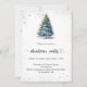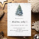 Eine Wintereinladung für ein Weihnachtsfest im Party. Ein weißer Hintergrund auf der Vorderseite mit einem von Hand gezeichnet, wasserfarbenen Kiefernbaum mit schneebedecktem Imitat und glitzerndem Glitzer. Personalisieren Sie Ihre Party-Daten und fügen Sie sie hinzu. Zurück: blaugrüner Hintergrund.