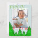 Einfache, moderne Weihnachtskarte mit einem Single-Foto, gerahmt in einem weißen Rahmen auf einem helleisblauen Hintergrund. Ein Wald aus geometrischen Bäumen mit Blendfarben von Grün fügt ein einzigartiges Detail hinzu. Ein hellgrün und rot "fröhliches Weihnachten" in einem formschönen Schriftart mit einigen festlichen Schnörkeln. Personalisieren Sie mit einer kurzen Nachricht und Ihren Namen, und das Jahr. Die Rückseite der Karte weist ein Baummuster in einem entsprechenden Farbschema auf.