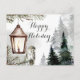 Silvester Card Happy Ferienkarte in Pastellfarben dargestellt: eine Eule, ein Weihnachtsbaumzweig, eine Laterne mit Kerze, ein Wald. Aquarelltechnik