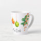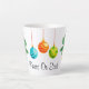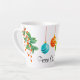 Für diejenigen, die einen zeitgenössischen Urlaub mögen, ist diese Sammlung von Blumen und Ornamenten genau das Richtige. Diese neueste Tasse zeichnet sich durch nicht-traditionelle Urlaubstöne und -designs aus. Die Blumengärten sind mit Orangenbeeren bedeckt, die Ornamente sind aquamarin, orange und limatgrün. Der Text lautet "Weltfrieden" kann angepasst werden.