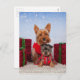 Zwei Yorkies sitzen mit Weihnachtsgeschenken.