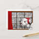 Dalmatinerhund trägt eine Weihnachtsmannmütze und Blicke heraus das Fenster am Schnee warteten Weihnachten und das Aufpassen für Sankt-Hundeliebhaber Weihnachtsfeiertags-Grußkarte