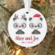 Weihnachtsschmuck mit 2 niedlichen Pandas, die Weihnachtsmannmütze tragen, und Rudolph roten Nasenreiniger. Es kommt personalisiert mit Ihren Namen und Datum.