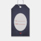 Eleganter schick Winter, dunkel Mitternacht blau, metallisches Kupfer, rot und hellgraue Geschenkmarke mit einer großen Weihnachtsbaumglobe Dekoration, handgemalten Kiefern und "joy" angesagter Kalligraphie-Schrift.