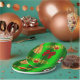 Ein niedliches Weihnachtsgeschmack mit Weihnachtsdekorationen, goldenen Weihnachtsbäumen, goldenen, roten und roten Beeren, roten Seidenbögen und einem bezaubernden Schneemann mit rotem Samtkopfteil und -weste, alles auf grünem Hintergrund, um Ihrem Zuhause während der Ferien noch etwas Weihnachtsfröhlichkeit zu verleihen.