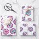 Weihnachtsdekorationen aus Purpur, Pinks und Blues Wrapping Paper Sheets, jedes mit einem anderen gemusterten Ornament-Design.